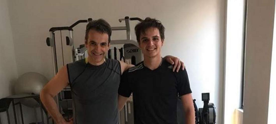 Η φωτογραφία δείχνει τον πρόεδρο της ΝΔ και τον Κωνσταντίνο Μητσοτάκη στο γυμναστήριο .