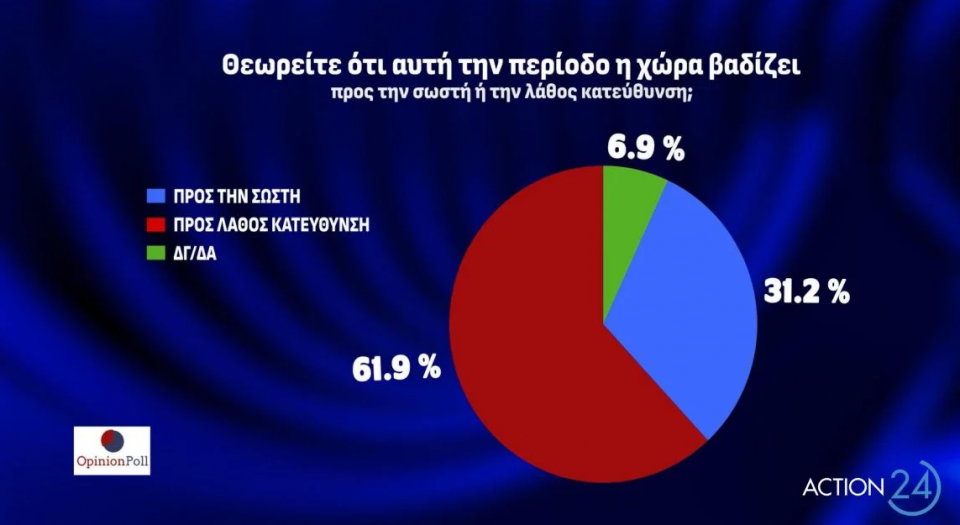 Τέλος το 61,9% των πολιτών θεωρεί ότι αυτή την περίοδο η χώρα βαδίζει στην λάθος κατεύθυνση. Μόλις το 31,2% απαντά ότι η χώρα κινείται στην σωστή κατεύθυνση.