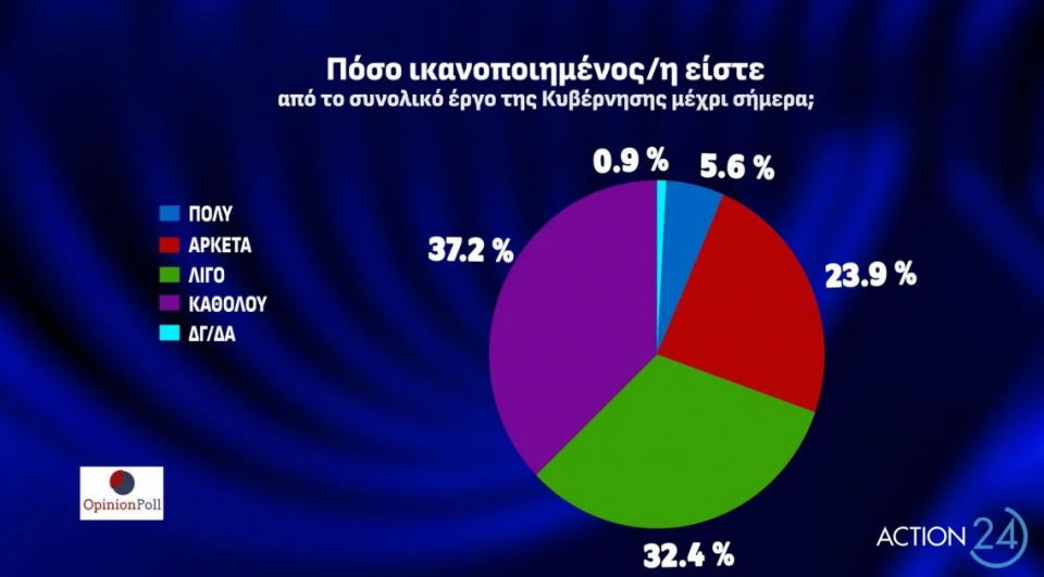 Στην ερώτηση πόσο ικανοποιημένοι είναι από το συνολικό έργο της κυβέρνησης οι πολίτες απαντούν σε ποσοστό 37,2% «καθόλου». Το 32,4% λέει «λίγο» και το 23,9% «αρκετά».