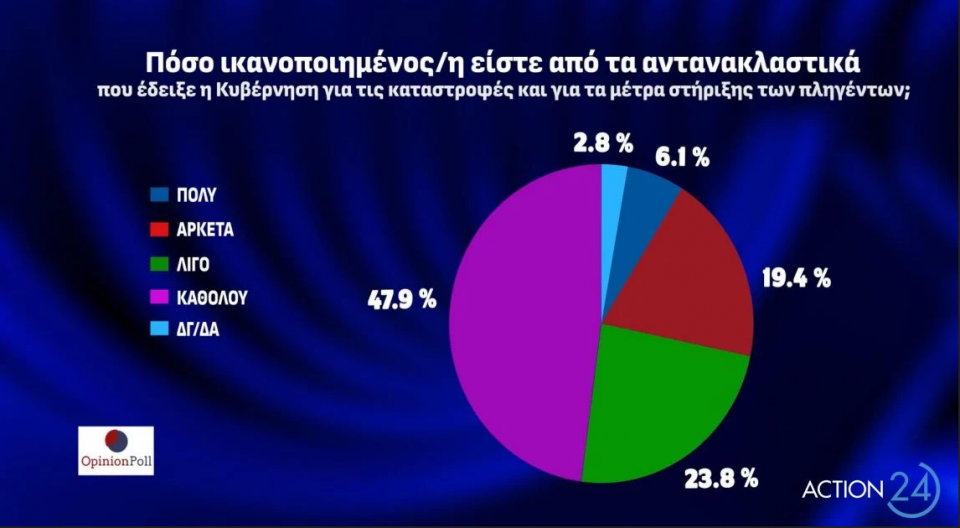 Στο κυβερνητικό έργο οι πολίτες δείχνουν ανικανοποίητοι με τα αντανακλαστικά που έδειξε η κυβέρνηση για τις καταστροφές και τα μέτρα στήριξης των πληγέντων. Το 47,9% απαντά ότι δεν είναι καθόλου ικανοποιημένο από την κυβέρνηση και το 23,8% ότι είναι λίγο ικανοποιημένο.