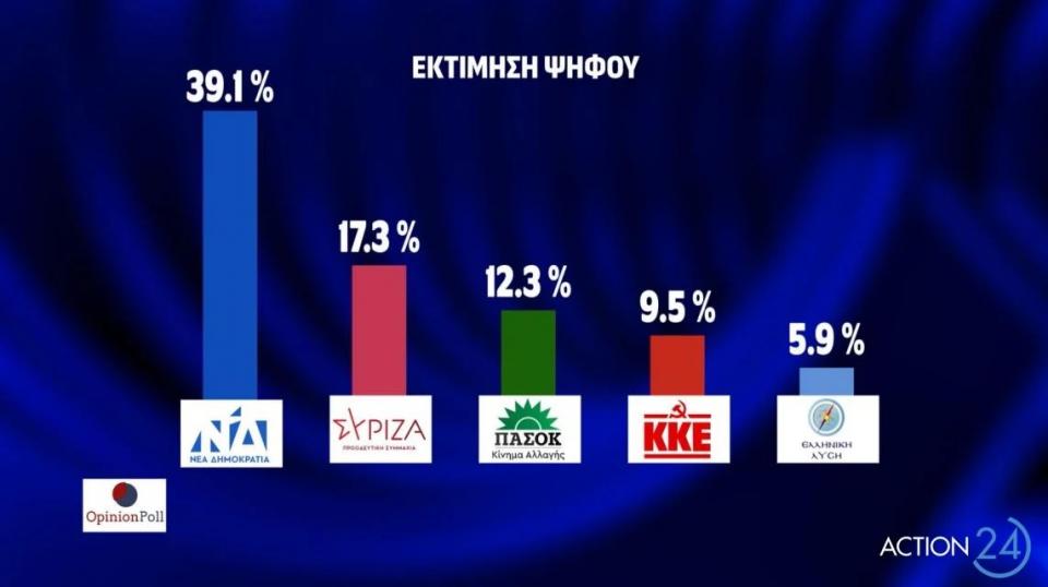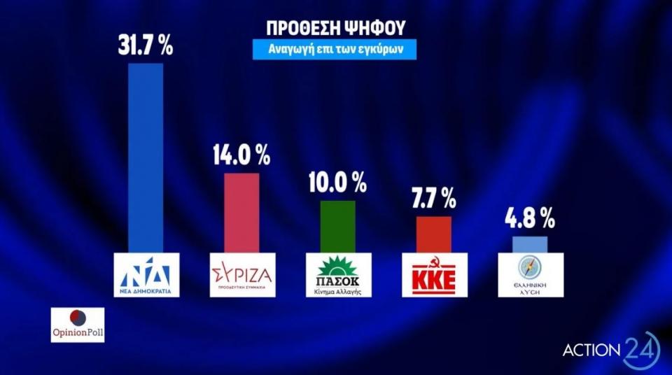 Σύμφωνα με την δημοσκόπηση της Opinion Poll για το Action24, στην πρόθεση ψήφου η ΝΔ συγκεντρώνει 31,7%, ο ΣΥΡΙΖΑ 14%, το ΠΑΣΟΚ 10% ενώ ακολουθούν ΚΚΕ με 7,7%, η Ελληνική Λύση 4,8%.