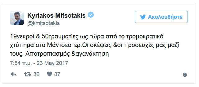 Κ. Μητσοτάκης: Αποτροπιασμός για τρομοκρατικό χτύπημα στο Μάντσεστερ (ΦΩΤΟ)