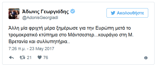 Τα συλλυπητήρια τους εξέφρασαν ο Κυριάκος Μητσοτάκης και ο Άδωνις Γεωργιάδης, από νωρίς το πρωί της Τρίτης μετά το αιματηρό μακελείο σε συναυλία στο Μάντσεστερ.