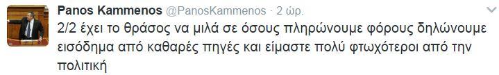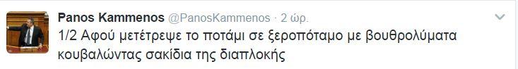 Αυτό αναφέρει, σε ανάρτησή του στο twitter, ο πρόεδρος των Ανεξάρτητων Ελλήνων και υπουργός Εθνικής Άμυνας, Πάνος Καμμένος, απαντώντας στον επικεφαλής του «Ποταμιού», Σταύρο Θεοδωράκη.