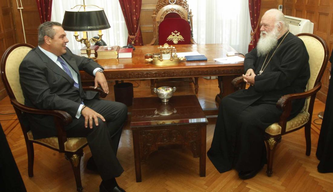 Λάδι στη φωτιά του κυβερνητικού "εμφυλίου" έριξε ο υπουργός Εθνικής Άμυνας, Πάνος Καμμένος, ο οποίος σε συνάντηση που είχε με τον Αρχιεπίσκοπο Ιερώνυμο και για το θέμα των Θρησκευτικών, το μεσημέρι της Τετάρτης εμφανίστηκε κάθετος ότι οι Ανεξάρτητοι Έλληνες «δεν πρόκειται να συμφωνήσουμε σε τίποτα αν δεν γίνουν δεκτά τα αιτήματα της ιεραρχίας».