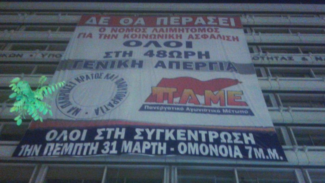 Αυτή την στιγμή οι δυνάμεις του ΠΑΜΕ από συνδικάτα έχουν προχωρήσει σε Συμβολική Κατάληψη στο Υπουργείο Οικονομικών στο Σύνταγμα, διαμαρτυρόμενοι για τα νέα αντεργατικά μέτρα για το Ασφαλιστικό, το Φορολογικό και τους πλειστηριασμούς.