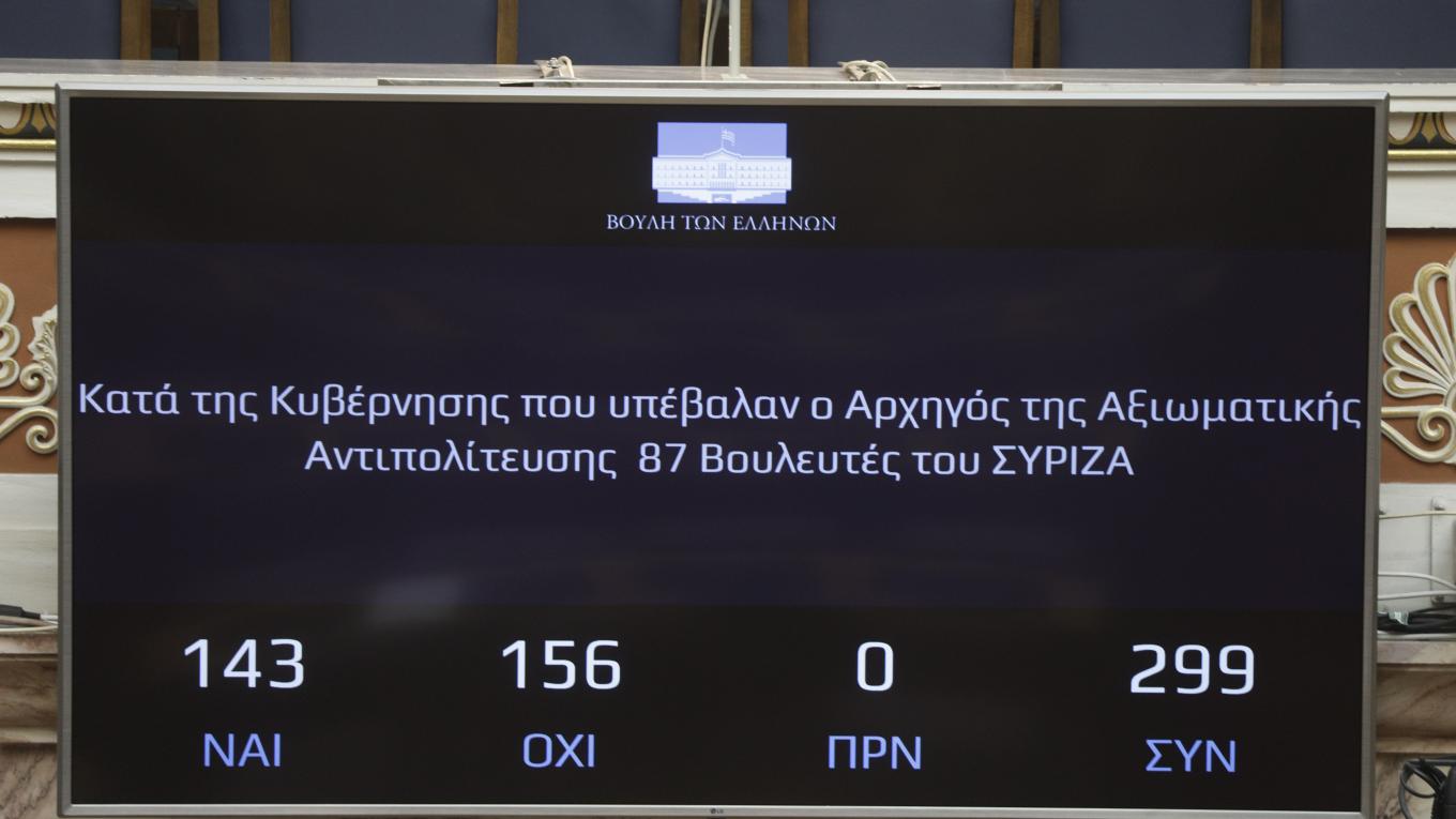 Ολοκληρώθηκε το μεσημέρι της Παρασκευής η τριήμερη συζήτηση της πρότασης δυσπιστίας με την ονομαστική ψηφοφορία στη Βουλή, η οποία απορίφθηκε με 156 «όχι» και 143 «ναι» .