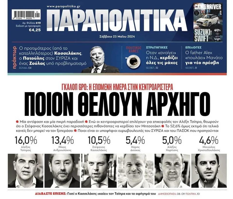 Όπως φαίνεται και από το πρωτοσέλιδο, στη δημοσκόπηση κυριαρχεί «μία αντίφαση και μία πικρή παραδοχή: Ενώ οι κεντροαριστεροί επιλέγουν για επικεφαλής τον Αλέξη Τσίπρα, θεωρούν ότι ο Στέφανος Κασσελάκης έχει περισσότερες πιθανότητες να κερδίσει τον Κυριάκο Μητσοτάκη.