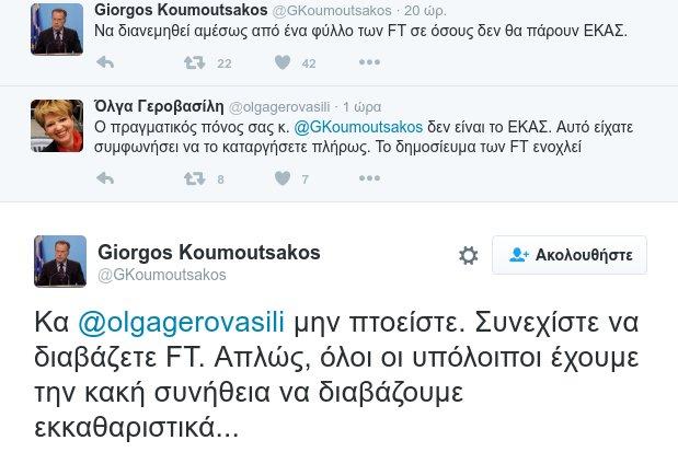 «Να διανεμηθεί αμέσως από ένα φύλλο των FT σε όσους δεν θα πάρουν ΕΚΑΣ», σχολίασε χαρακτηριστικά ο Γιώργος Κουμουτσάκος μέσω Twitter.