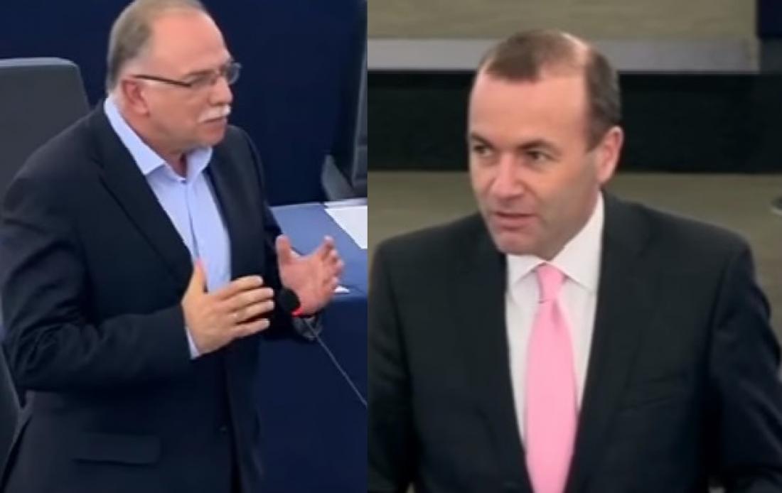 «Κύριε Βέμπερ, στα πέντε λεπτά της ομιλίας σας επιτεθήκατε πέντε φορές στον Έλληνα πρωθυπουργό, στον κύριο Τσίπρα, για να βοηθήσετε τον πολιτικό σας φίλο, τον κύριο Μητσοτάκη. Αλλά, δυστυχώς, η αλήθεια δεν σας βοηθά, γιατί οι φίλοι σας της ΝΔ άφησαν το 2009 την Ελλάδα με δημόσιο έλλειμμα 15,5%, με δημόσιο χρέος 125% του ΑΕΠ και στο τέλος του 2014 είχαν φθάσει μαζί με το ΠΑΣΟΚ το δημόσιο χρέος στο 180% του ΑΕΠ.