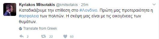 "Καταδικάζουμε την επίθεση στο #Λονδίνο. Πρώτη μας προτεραιότητα η #ασφαλεια των πολιτών. Η σκέψη μας είναι με τις οικογένειες των θυμάτων" , έγραψε ο πρόεδρος της ΝΔ στον λογαριασμό του.