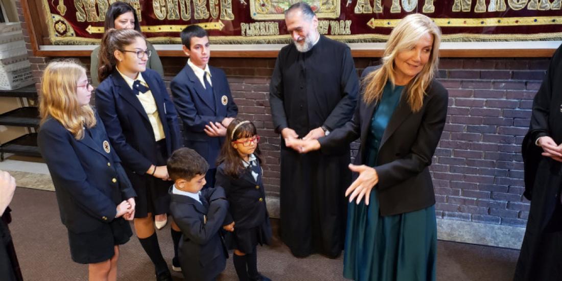 Η σύζυγος του πρωθυπουργού, Μαρέβα Μητσοτάκη συνοδευόμενη από τον από τον υφυπουργό Εξωτερικών, αρμόδιο για θέματα Απόδημου Ελληνισμού, Αντώνη Διαματάρη, βρέθηκε στο δημοτικό σχολείο της Αγίας Αικατερίνης στην Αστόρια και το «Ουίλιαμ Σπυρόπουλος» της κοινότητας Αγίου Νικολάου στο Φλάσινγκ, όπου την υποδέχθηκε ο Αρχιεπίσκοπος Αμερικής, Ελπιδοφόρος.