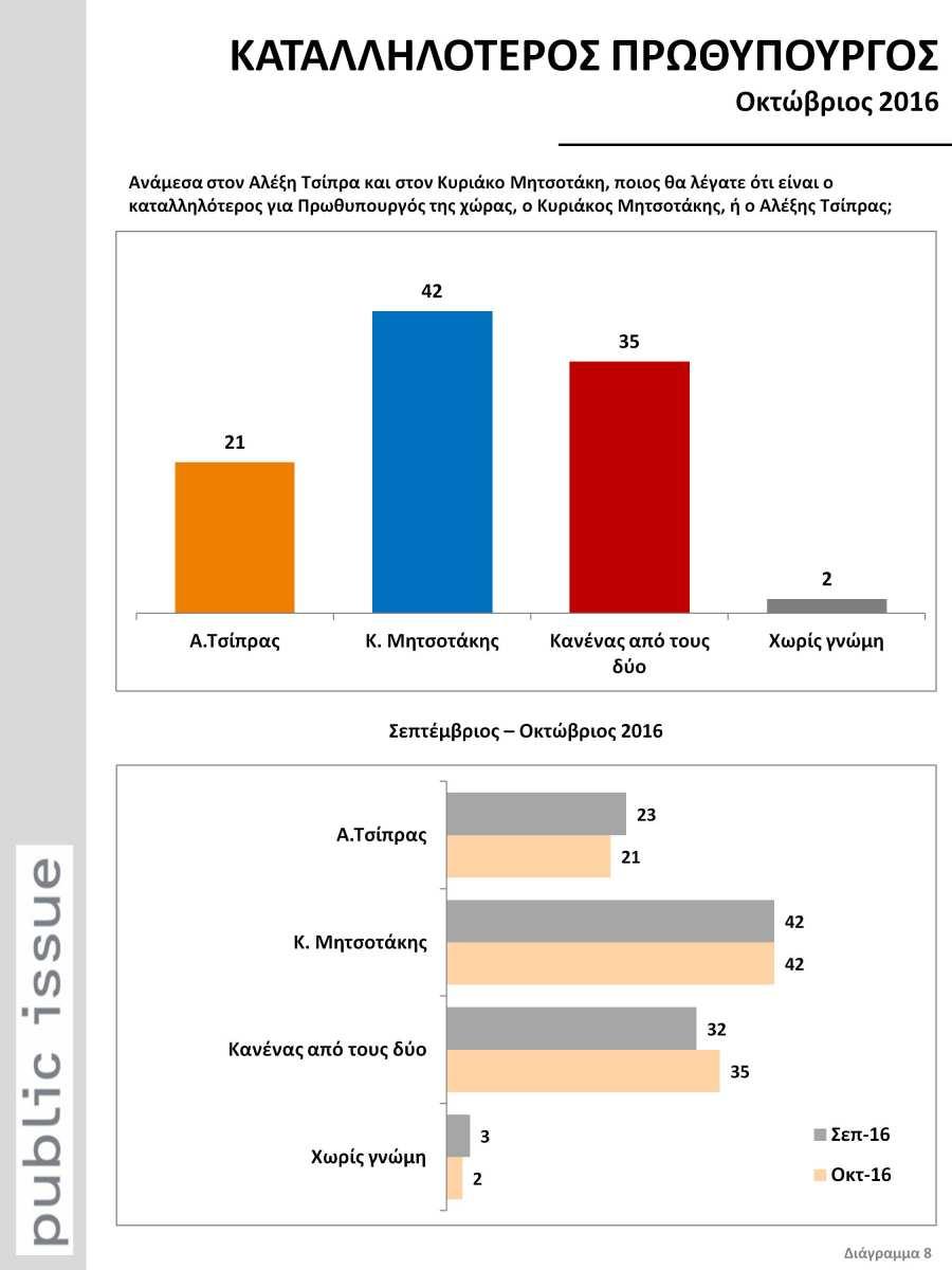 Στην καταλληλότητα για την πρωθυπουργία προηγείται ο Κυριάκος Μητσοτάκης με 42% έναντι του Αλέξη Τσίπρα, ο οποίος συγκεντρώνει το 21%, ενώ κανένας από τους δύο συγκεντρώνει 35%.