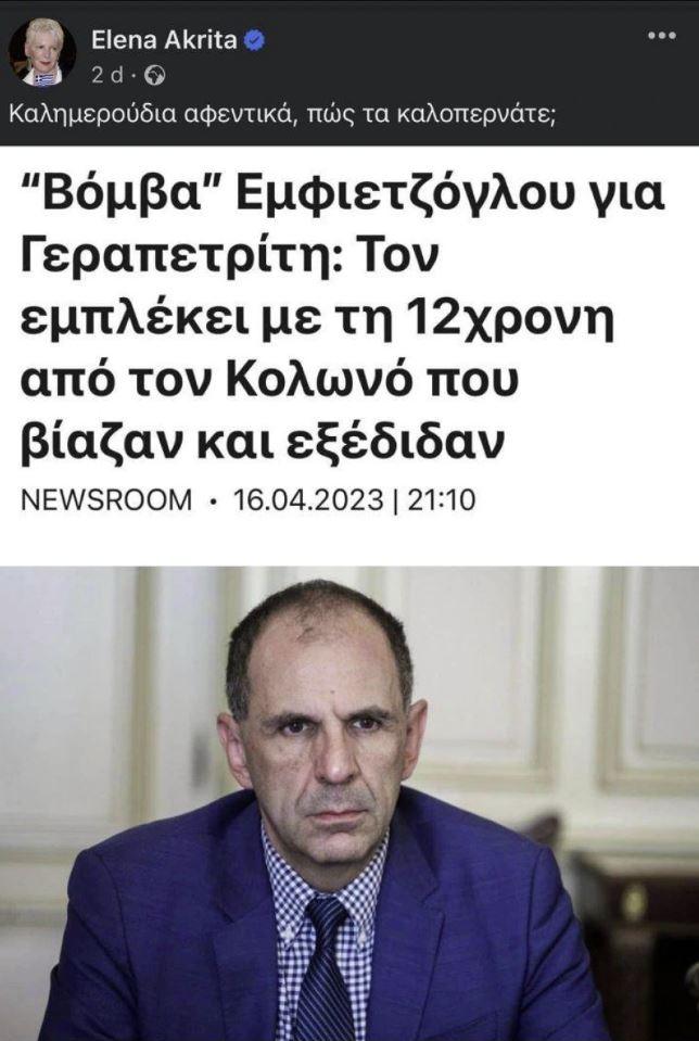 Μάλιστα σήμερα ο κ. Γεραπετρίτης συνέχισε τις νομικές του ενέργειες καταθέτοντας μήνυση, σύμφωνα με πληροφορίες, κατά της δημοσιογράφου Έλενας Ακρίτα, η οποία σε ανάρτησή της είχε αναπαράξει το δημοσίευμα για την ανάρτηση του κ. Εμφιετζόγλου, γράφοντας «Καλημερούδια αφεντικά, πώς τα καλοπερνάτε;».