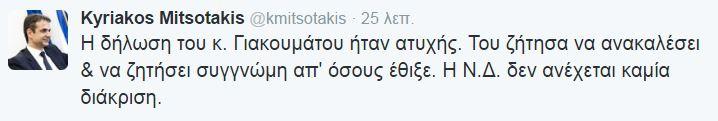 «Η δήλωση του κ. Γιακουμάτου ήταν ατυχής. Του ζήτησα να ανακαλέσει & να ζητήσει συγγνώμη απ' όσους έθιξε. Η Ν.Δ. δεν ανέχεται καμία διάκριση», ανέβασε στο λογαριασμό του ο πρόεδρος της ΝΔ.