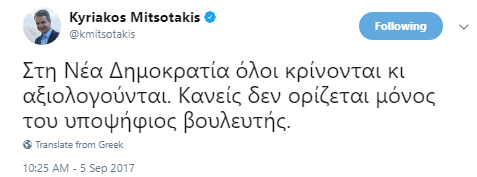 «Στη Νέα Δημοκρατία όλοι κρίνονται κι αξιολογούνται. Κανείς δεν ορίζεται μόνος του υποψήφιος βουλευτής» , έγραψε στο λογαριασμό του ο πρόεδρος της ΝΔ.