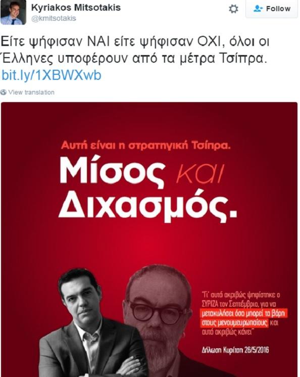Τον δημοφιλή τόπο κοινωνικής δικτύωσης επέλεξε ο Κυριάκος Μητσοτάκης για να σχολιάσει και δε με αιχμηρό τρόπο τα όσα ανέφερε ο βουλευτής του ΣΥΡΙΖΑ, Γιώργος Κυρίτσης, για συνειδητή επιλογή της κυβέρνησης να επιβαρύνει όσους ψήφισαν "Ναι" στο δημοψήφισμα του Ιουλίου, τους οποίους αποκάλεσε "μενουμευρωπαίους".