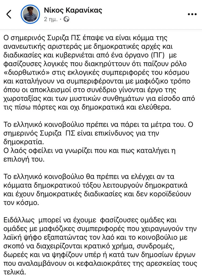 Σημειώνεται ότι προηγουμένως, ο κ. Καρανίκας είχε προβεί στην παρακάτω ανάρτηση: