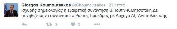 «Ισχυρής σημειολογίας η εξαιρετική συνάντηση Βλαντιμίρ Πούτιν – Κυριάκου Μητσοτάκη. Δεν συνηθίζεται να συναντάται ο Ρώσος Πρόεδρος με Αρχηγό της Αξιωματικής Αντιπολίτευσης», σημείωσε κ.Κουμουτσάκος.