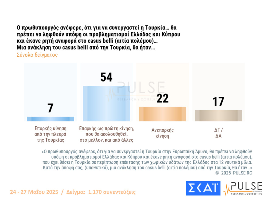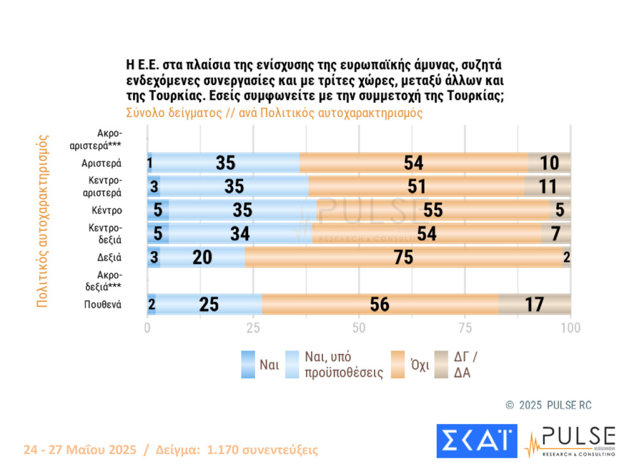 Το 56% διαφωνεί με τη συμμετοχή της Τουρκίας στην κοινή ευρωπαϊκή άμυνα, ωστόσο ο ένας στους τρεις λέει «ναι, υπό προϋποθέσεις», ενώ το 54% εκτιμά ότι η άρση του casus belli από την Άγκυρα θα ήταν ένα επαρκές «πρώτο βήμα που θα ακολουθηθεί από άλλες κινήσεις».