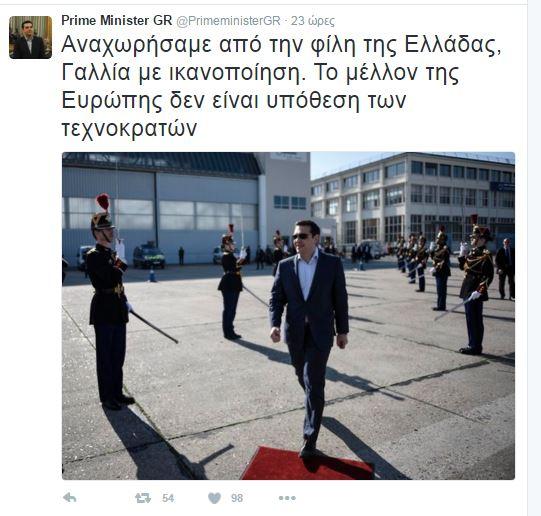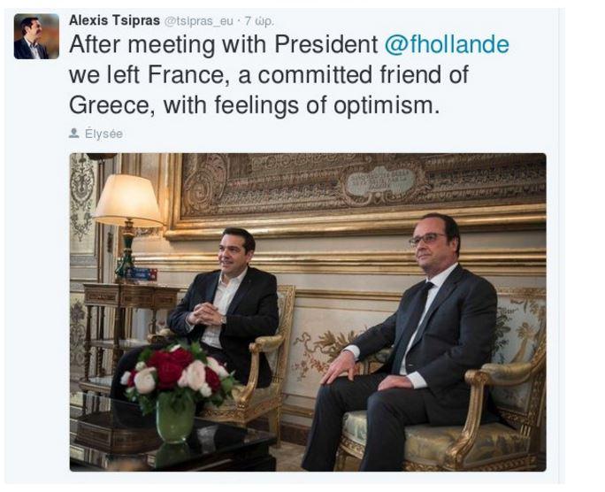 Μετά την ολοκλήρωση της συνάντησής του με τον Φρανσουά Ολάντ και αναχωρώντας από το Παρίσι για να επισκεφθεί το Στρασβούργο, έκανε την ακόλουθη ανάρτηση στο λογαριασμό του στο Τwitter: «Αναχωρήσαμε από τη φίλη της Ελλάδας, Γαλλία, με ικανοποίηση. Το μέλλον της Ευρώπης δεν είναι υπόθεση των τεχνοκρατών».
