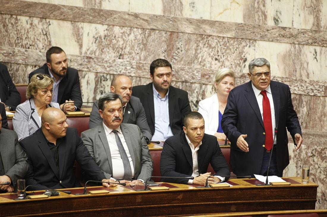 Η Χρυσή αυγή δεν θα ψηφίσει τον εκλογικό νόμο, δήλωσε, ο Νίκος Μιχαλολιάκος και πριν αποχωρήσει από τη Βουλή είπε στο λόγο του απευθυνόμενος στον ΣΥΡΙΖΑ "Μη μιλάτε για έκφραση λαϊκής θέλησης. Ένα ανατολίτικο παζάρι είναι αυτό και εμείς δεν θα συμμετάσχουμε.
