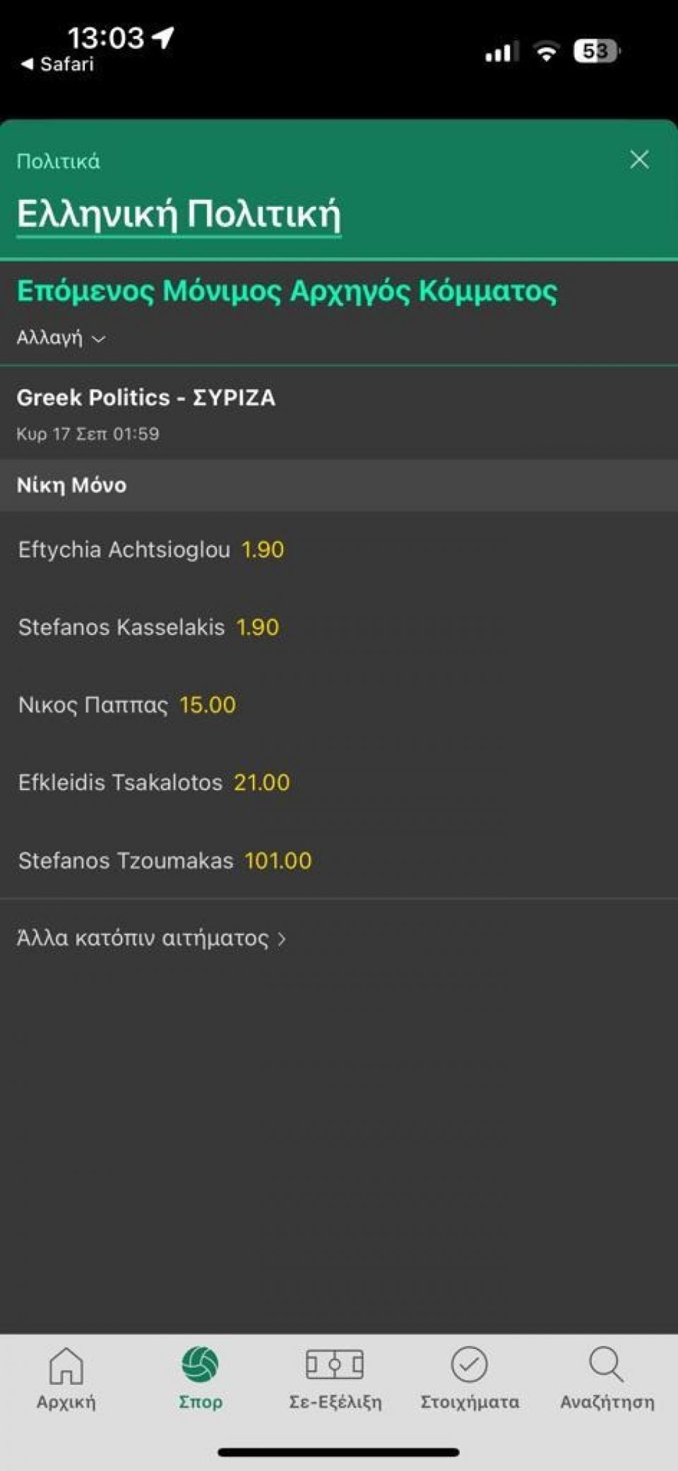 Ισοπαλία καταγράφει, την ίδια ώρα, άλλη στοιχηματική εταιρία, καθώς Έφη Αχτσιόγλου και Στέφανος Κασσελάκης σημειώνουν απόδοση 1.90 και ακολουθούν ο Νίκος Παππάς με 15.00, ο Ευκλείδης Τσακαλώτος με 21.00 και τέλος ο Στέφανος Τζουμάκας με 101.00.