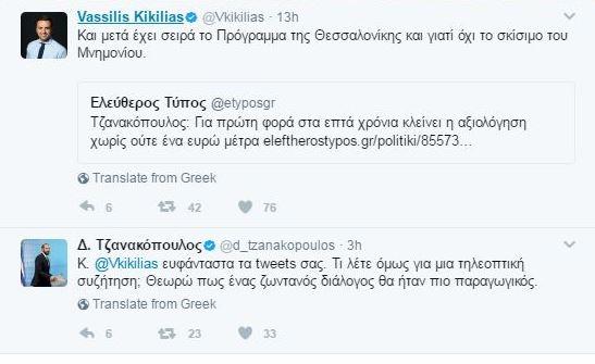 «Ευφάνταστα τα tweets σας. Τι λέτε όμως για μια τηλεοπτική συζήτηση; Θεωρώ πως ένας ζωντανός διάλογος θα ήταν πιο παραγωγικός», έγραψε στον προσωπικό του λογαριασμό στο Twitter, ο κυβερνητικός εκπρόσωπος Δημήτρης Τζανακόπουλος, απαντώντας σε ανάρτηση του εκπροσώπου Τύπου της Ν.Δ., Βασίλη Κικίλια.