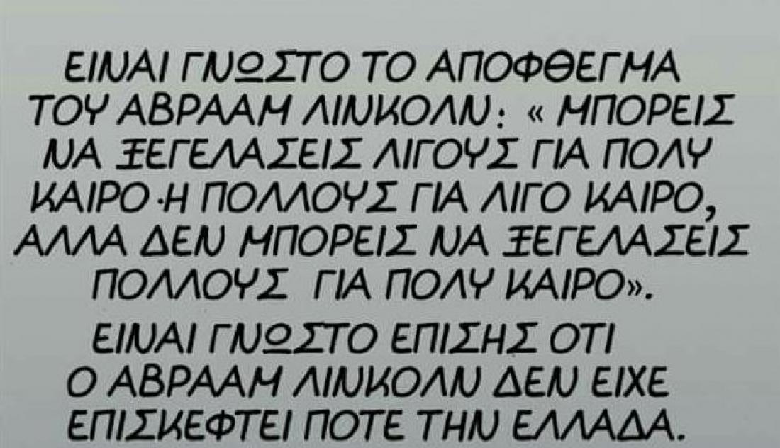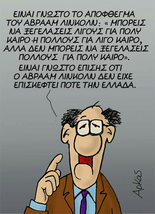 Ο γνωστός σκιτσογράφος Αρκάς επανήλθε με ένα ακόμα «φαρμακερό» σκίτσο και σχόλιο για την κυβέρνηση του Αλέξη Τσίπρα και την πολιτική της. Αυτή τη φορά επέλεξε το απόφθεγμα του Αβραάμ Λίνκολν «Μπορείς να ξεγελάσεις λίγους για πολύ καιρό ή πολλούς για λίγο καιρό, αλλά δεν μπορείς να ξεγελάσεις πολλούς για πολύ καιρό».