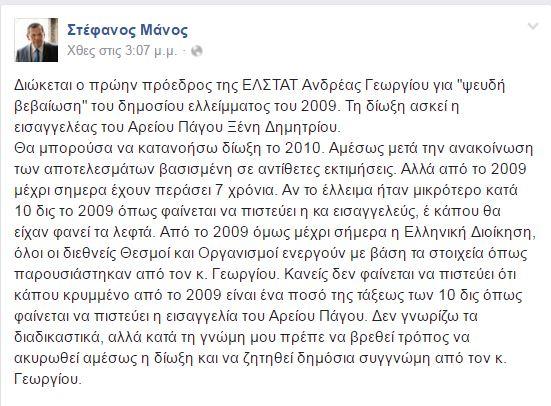 Οι δύο "φίλοι" του κ. Μάνου βρέθηκαν στην ανάγκη και ο καλός φίλος Στέφανος ήταν εκεί, με όσες δυνάμεις και απήχηση έχει το προφίλ του στο Facebook και στην πολιτική, να απαιτήσει «να ακυρωθεί αμέσως η δίωξη και να ζητηθεί δημόσια συγγνώμη από τον κ. Γεωργίου».
