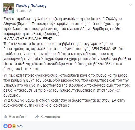 «Στην απαράδεκτη, γελοία και μίζερη ανακοίνωση του Ιατρικού Συλλόγου Αθηνων (δηλ. του Πατουλη συγκεκριμένα, ο οποίος μετά που έχασε την πρόσβαση στο υπουργείο υγείας που είχε επι Αδώνι -Βορίδη εχει πάθει παράκρουση απώλειας εξουσίας )