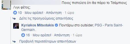 Υπενθυμίζουμε ότι ο πρόεδρος της ΝΔ Κυρ. Μητσοτάκης, στη συζήτηση που είχε προχτες στο facebook, σε σχετική ερώτηση, «πόνταρε» στην Παρί Σεν Ζερμέν.