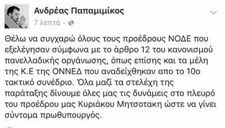 "Από μικρό παιδί έχω υπηρετήσει την ΟΝΝΕΔ, σχεδόν από όλες τις θέσεις. Έχω ζήσει χαρές και λύπες. Έχω κερδίσει και έχω χάσει πολιτικές διαδικασίες. Σε κάθε συνέδριο ψηφιζόταν αλλαγές στον κανονισμό, λαμβάνονταν πολιτικές αποφάσεις, εκλέγονταν τα νέα όργανα από τους συνέδρους και αυτό αποτελούσε γιορτή για την οργάνωση. Δυστυχώς αυτά τελείωσαν με το φιάσκο του 10ου Συνεδρίου της ΟΝΝΕΔ. Δεν στήθηκαν κάλπες για καμία διαδικασία, οι σύνεδροι αποχώρησαν χωρίς συμμετοχή σε πολιτικές αποφάσεις και ψηφοφορίες ενώ δεν αποφασίστηκε καμία τροποποίηση του κανονισμού. Πλήρης διάλυση. Κάποιοι για να εξυπηρετήσουν τις προσωπικές τους επιδιώξεις, οδηγούν την οργάνωση στον γκρεμό και στην πλήρη απαξίωση χωρίς να αντιλαμβάνονται το μεγαλείο της . Θα μας βρουν απέναντι. Οχι μόνο εμένα , αλλα όλους όσους αισθάνονται μέλη της μεγάλης οικογένειας της ΟΝΝΕΔ".