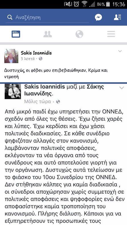 Ο πρώην πρόεδρος της ΟΝΝΕΔ Σάκης Ιωαννίδης κατήγγειλε μέσω ανάρτησης που έκανε στη σελίδα του στο fb τα όσα έγιναν στο Συνέδριο.