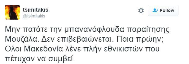 Η ανάρτηση του συμβούλου του πρωθυπουργού έγινε στον λογαριασμό του στο Twitter: «Μην πατάτε την μπανανόφλουδα παραίτησης Μουζάλα. Δεν επιβεβαιώνεται. Ποια πρώην; Ολοι Μακεδονία λένε πλήν εθνικιστών που πέτυχαν να συμβεί», έγραψε.