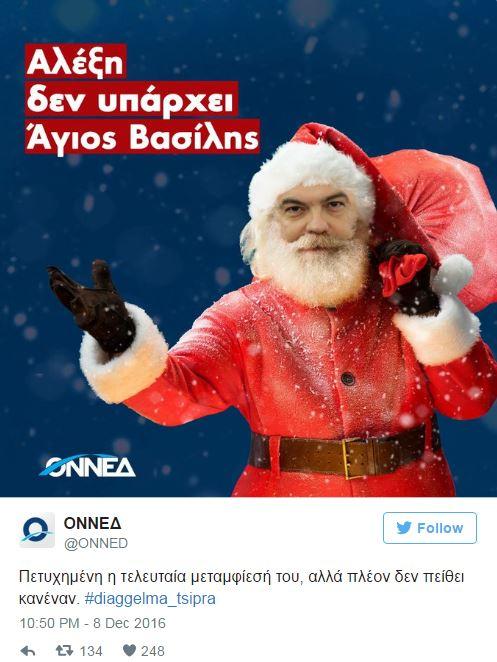 Τον πρωθυπουργό «έβαλε στο μάτι» η οργάνωση νέων της Νέας Δημοκρατίας, ΟΝΝΕΔ, αναρτώντας μια εικόνα με ντυμένο τον Αλέξη Τσίπρα ως Άγιο Βασίλη στο Twitter.