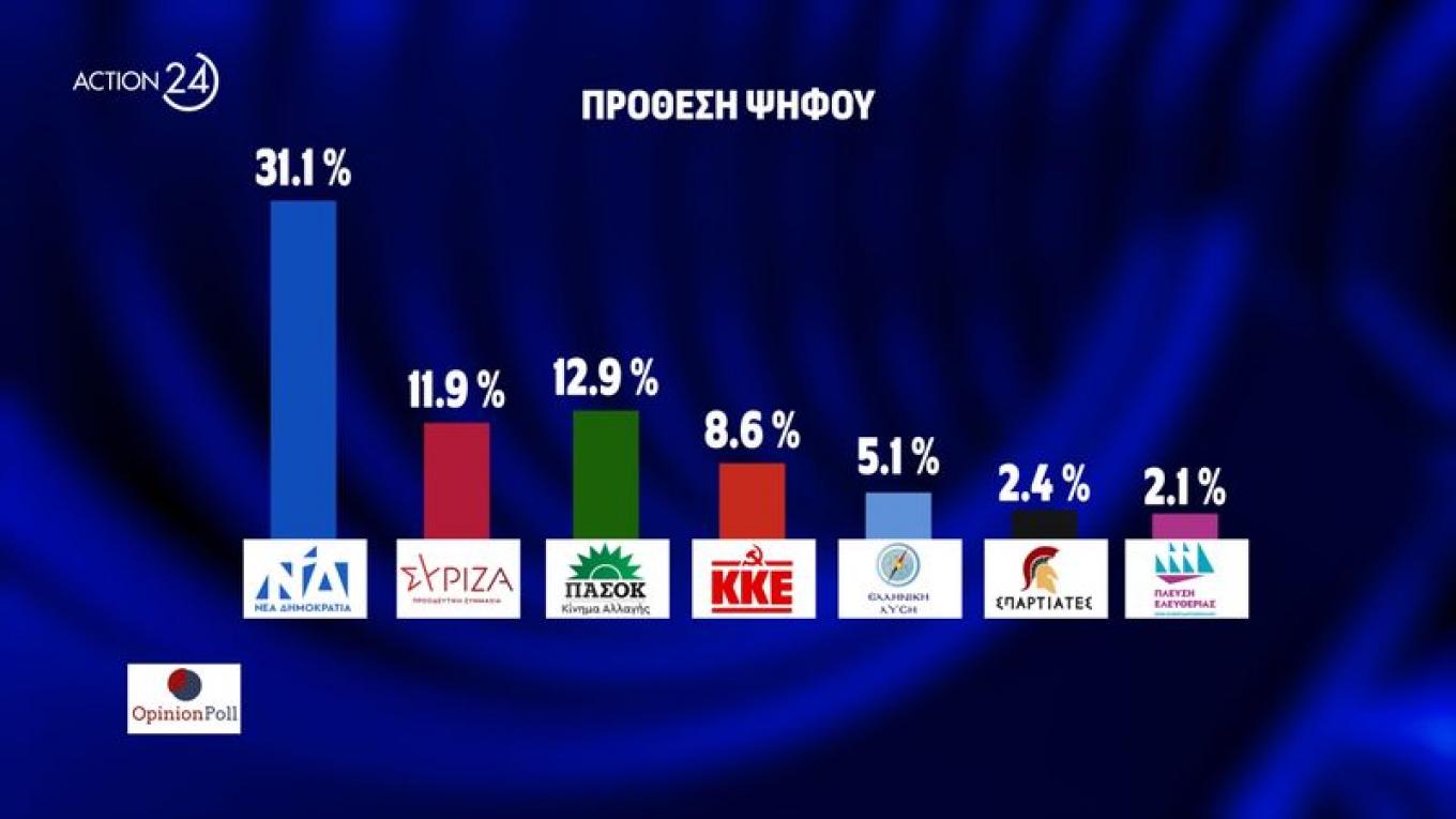 Συγκεκριμένα, στην πρόθεση ψήφου, τα κόμματα συγκεντρώνουν τα εξής ποσοστά: Νέα Δημοκρατία 31,1%, ΠΑΣΟΚ 12,9%, ΣΥΡΙΖΑ 11,9%, ΚΚΕ 8,6%, Ελληνική Λύση 5,1%, Σπαρτιάτες 2,4%, Νίκη 3,2%, Πλεύση Ελευθερίας 2,1%, ΜέΡΑ25 1,9%.