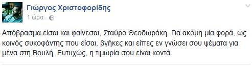 «Απόβρασμα είσαι και φαίνεσαι, Σταύρο Θεοδωράκη. Για ακόμη μία φορά, ως κοινός συκοφάντης που είσαι, βγήκες και είπες εν γνώσει σου ψέματα για μένα στη Βουλή» (σ.σ. ότι παραμένει εκδότης της εβδομαδιαίας εφημερίδας «Χωνί», ενώ είναι διορισμένος συνεργάτης).