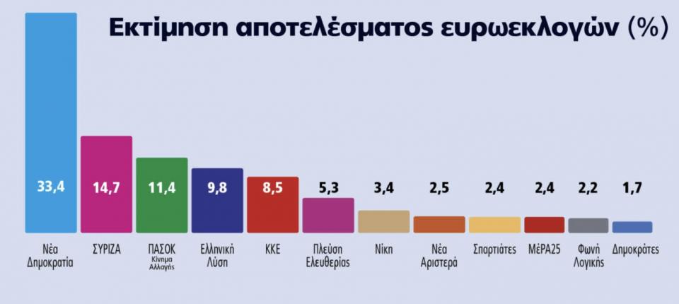 Ακολουθεί το ΠΑΣΟΚ με 11,4%, η Ελληνική Λύση με 9,8%, το ΚΚΕ με 8,5%, η Πλεύση Ελευθερίας με 5,3%, η Νίκη με 3,4% η Νέα Αριστερά με 2,5%, οι Σπαρτιάτες (που ο Άρειος Πάγος απαγόρευσε τη συμμετοχή τους στις εκλογές) με 2,4%, το ΜέΡα25 με 2,4%, η Φωνή Λογικής με 2,2% και οι Δημοκράτες με 1,7%.