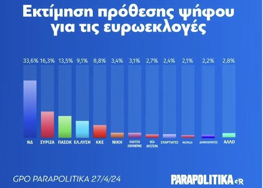 Και σε δημοσκόπηση της εταιρείας GPO για τα «Παραπολιτικά» το κυβερνών κόμμα προηγείται στην «κούρσα» των ευρωεκλογών με ποσοστό 33,6%.
