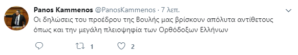 «Οι δηλώσεις του προέδρου της Βουλής μας βρίσκουν απόλυτα αντίθετους όπως και την μεγάλη πλειοψηφία των Ορθόδοξων Ελλήνων» , ανέφερε ο πρόεδρος των ΑΝΕΛ, σε ανάρτησή του στο Twitter.