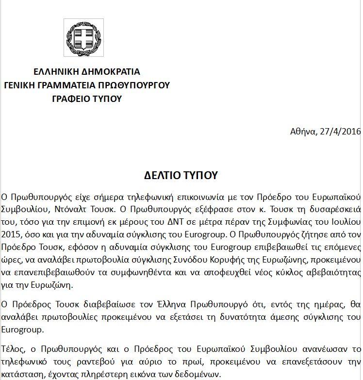 Συγκεκριμένα, συμφωνα με το Μαξίμου, ο Πρωθυπουργός είχε σήμερα τηλεφωνική επικοινωνία με τον Πρόεδρο του Ευρωπαϊκού Συμβουλίου, Ντόναλτ Τουσκ. Ο πρωθυπουργός εξέφρασε στον κ. Τουσκ τη δυσαρέσκειά του, τόσο για την επιμονή εκ μέρους του ΔΝΤ σε μέτρα πέραν της Συμφωνίας του Ιουλίου 2015, όσο και για την αδυναμία σύγκλησης του Eurogroup. Ο Πρωθυπουργός ζήτησε από τον Πρόεδρο Τουσκ, εφόσον η αδυναμία σύγκλησης του Eurogroup επιβεβαιωθεί τις επόμενες ώρες, να αναλάβει πρωτοβουλία σύγκλησης Συνόδου Κορυφής της Ευρωζώνης, προκειμένου να επανεπιβεβαιωθούν τα συμφωνηθέντα και να αποφευχθεί νέος κύκλος αβεβαιότητας για την Ευρωζώνη.