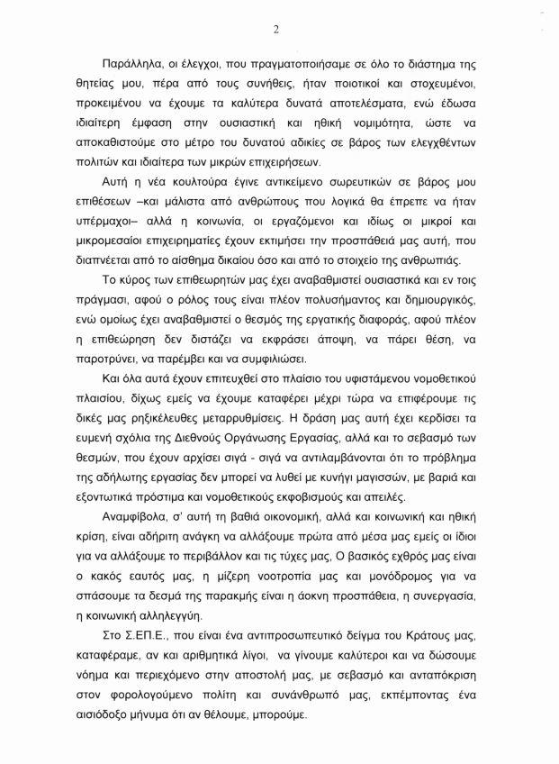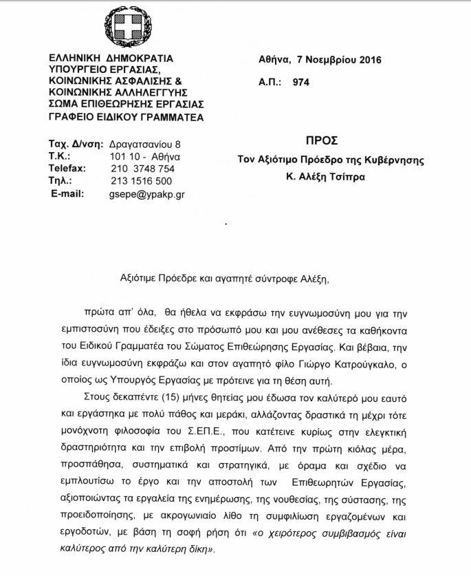 Επιστολή παραίτησης προς τον πρωθυπουργό Αλέξη Τσίπρα , απέστειλε ο ειδικός γραμματέας του Σώματος Επιθεώρησης Εργασίας (ΣΕΠΕ) Γιάννης Σούκος. Μεταξύ άλλων, ο κ. Σούκος αναφέρει στην εν λόγω επιστολή: «Η δράση μας έχει κερδίσει τα ευμενή σχόλια της Διεθνούς Οργάνωσης Εργασίας, αλλά και το σεβασμό των θεσμών, που έχουν αρχίσει σιγά-σιγά να αντιλαμβάνονται ότι το πρόβλημα της αδήλωτης εργασίας δεν μπορεί να λυθεί με κυνήγι μαγισσών, με βαριά και εξοντωτικά πρόστιμα και νομοθετικούς εκφοβισμούς και απειλές».
