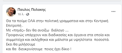 Υπενθυζιζεται ότι νωριτεραο Παύλος Πολάκης έγραψε στο Facebook: