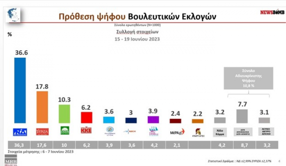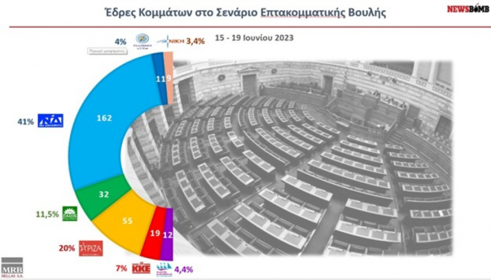 Ποσοστό μέχρι και 43,5% συγκεντρώνει η Νέα Δημοκρατία, ενώ εκτιμάται ότι θα πάρει πάνω από 160 έδρες, σύμφωνα με δημοσκόπηση της MRB που έγινε για λογαριασμό της ιστοσελίδας Newsbomb.