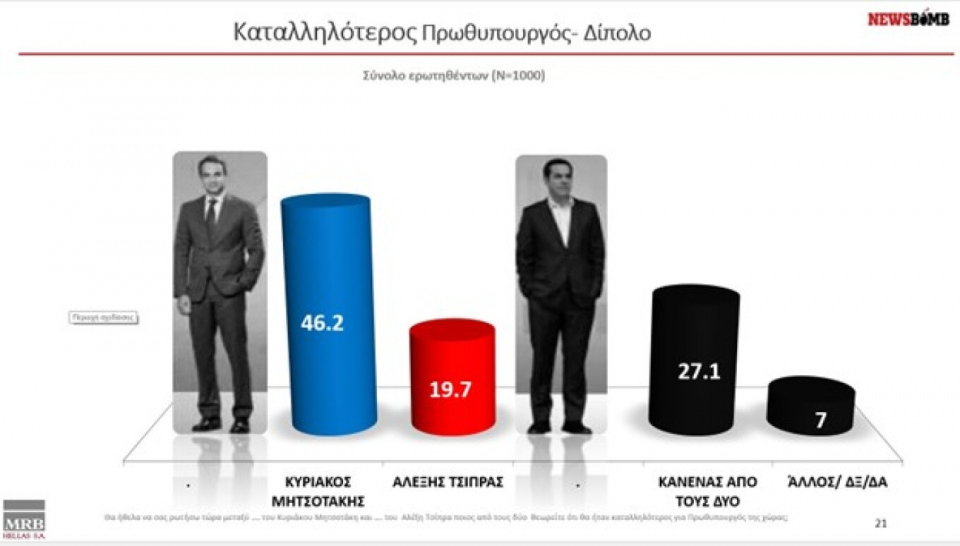 Σύμφωνα με την ίδια δημοσκόπηση η διαφορά με τον ΣΥΡΙΖΑ εκτιμάται στις 21 μονάδες.