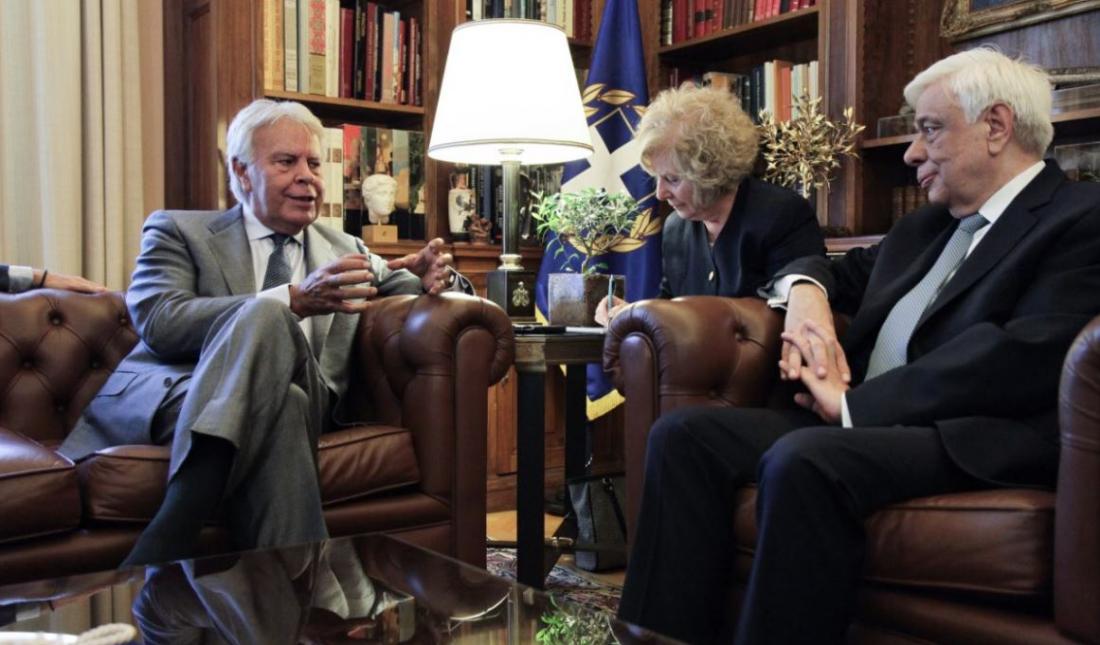 Ο Πρόεδρος της Δημοκρατίας Προκόπης Παυλόπουλος δέχθηκε νωρίτερα σήμερα στο Προεδρικό Μέγαρο τον πρώην πρωθυπουργό της Ισπανίας Φελίπε Γκονζάλες, συνοδευόμενο από το δήμαρχο Αθηναίων Γιώργο Καμίνη.