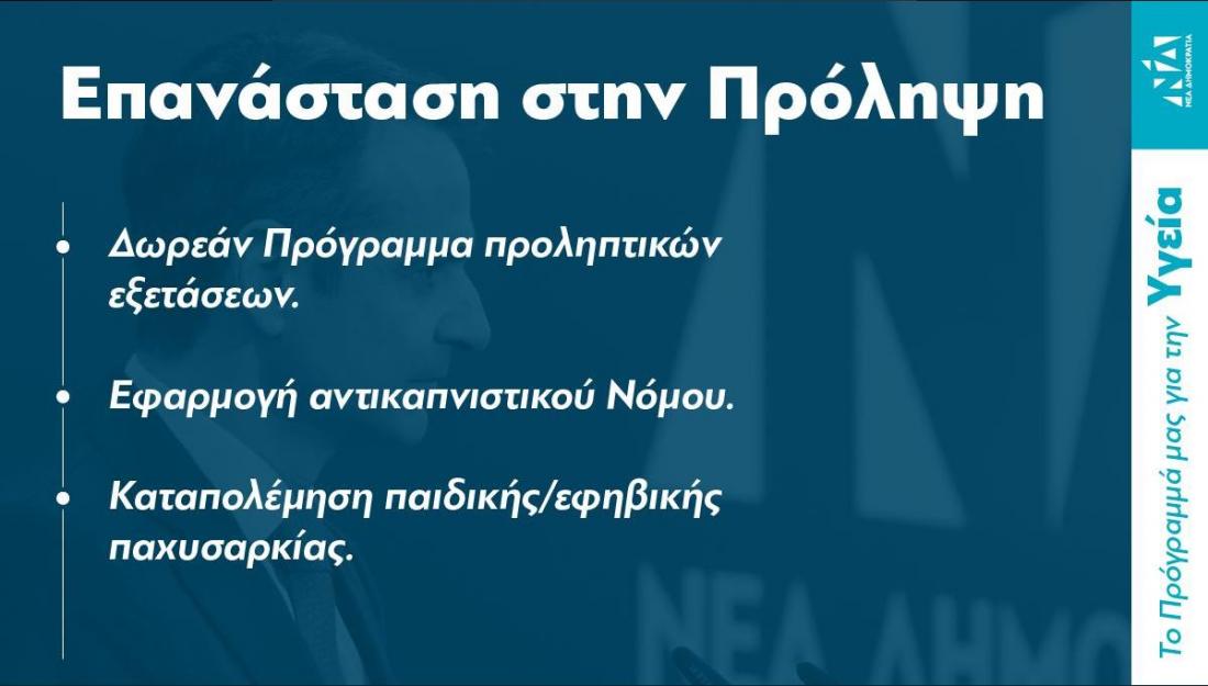 -- Δωρεάν προληπτικές εξετάσεις για όλους τους Έλληνες, με στόχο την έγκαιρη διάγνωση και την αποτελεσματική αντιμετώπιση των νόσων. Η ενημέρωση των πολιτών θα γίνεται και μέσω SMS ή email για τις αναγκαίες προληπτικές εξετάσεις ανάλογα με την ηλικιακή ομάδα, με αυτόματη παραπομπή σε κρατικές ή ιδιωτικές δομές.