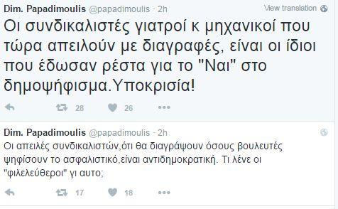 Επίθεση στους επιστημονικούς και συνδικαλιστικούς φορείς που με δημόσιες παρεμβάσεις τους υπενθυμίζουν στους βουλευτές μέλη τους την ευθύνη που έχουν έναντι της κοινωνίας και τους καλούν να καταψηφίσουν το νομοσχέδιο για το ασφαλιστικό, ασκεί από το twItter ο ευρωβουλευτής του ΣΥΡΙΖΑ Δημήτρης Παπαδημούλης.