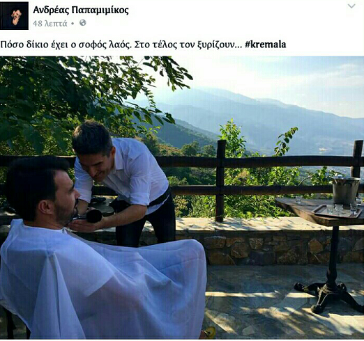 Ο Ανδρέας Παπαμιμίκος λίγο πριν την τελετή ανέβασε στο Facebook αυτή τη φωτογραφία με σχόλιο, στο τέλος ξυρίζουν τον γαμπρό. Πρόκειται βέβαιοα για το "ξύρισμα του γαμπρού", που αποτελεί παράδοση.